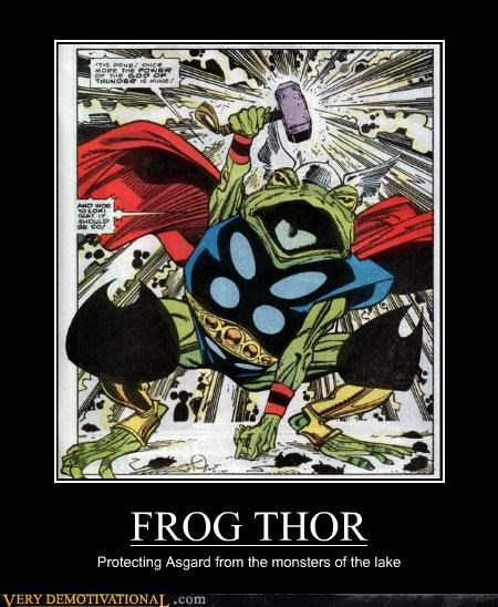 In contrast, the comic book divorces Thor’s essential characteristics from the character itself.  Stan Lee pictured Thor in his true form as “looking like Vikings of old, with the flowing beards, horned helmets, and battle clubs.”  But Thor’s consciousness is somewhat divided.  While “Blake” is always “Thor,” his status as one of the Aesir is something conditional, rather than something that he just is.  Thus, as recent apologists for Thor’s sex change argue, Thor in the comics is not always a mighty Norse god–sometimes he’s just a man—or even a frog.  Like the word Christ, Thor is apparently less a name than a title.